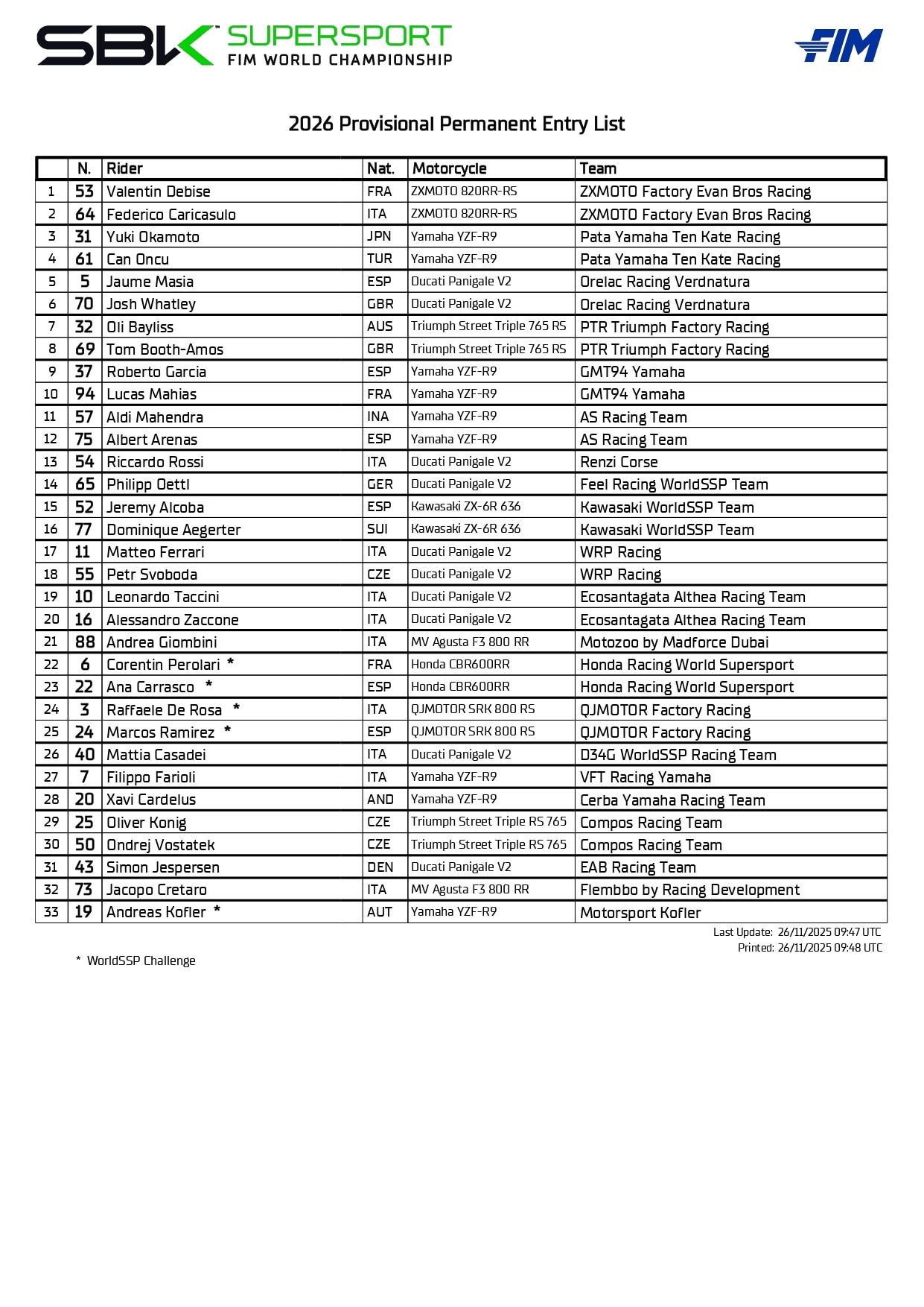 Saranno in totale dieci gli italiani al via della SSP 2026, praticamente un terzo della griglia. Oltre ai già citati Caricasulo e De Rosa, terminata l’esperienza nel team MV Agusta Squadra Corse Filippo Farioli riparte dalla Yamaha R9 del Team VFT Racing. Da Matteo Ferrari che proseguirà con il Team WRP dopo aver corso gli ultimi round del 2024, a Mattia Casadei che sarà al via con la Panigale V2 del D34G Racing Team. Dopo aver terminato la stagione nel mondiale, Andrea Giombini debutterà a tempo pieno con la MV Agusta F3 800 del Team Motozoo, sempre sulla tre cilindri di Schiranna correrà anche Jacopo Cretaro – terzo nel JuniorGP STK600 – con il Team Flembbo mentre sulle Panigale del Team Althea correranno il confermato Leonardo Taccini e Alessandro Zaccone che dopo la conquista del titolo mondiale MotoE riparte dalla SSP. Debutterà invece in SSP dopo diversi anni di motomondiale Riccardo Rossi, il pilota ligure abbandonata la Moto3 sarà al via con la Ducati del Team Renzi Corse. Dal motomondiale arriva anche Albert Arenas, iridato Moto3 2020 che dopo cinque stagioni di Moto2 cambia paddock in cerca di successo con la R9 del AS Racing Team.